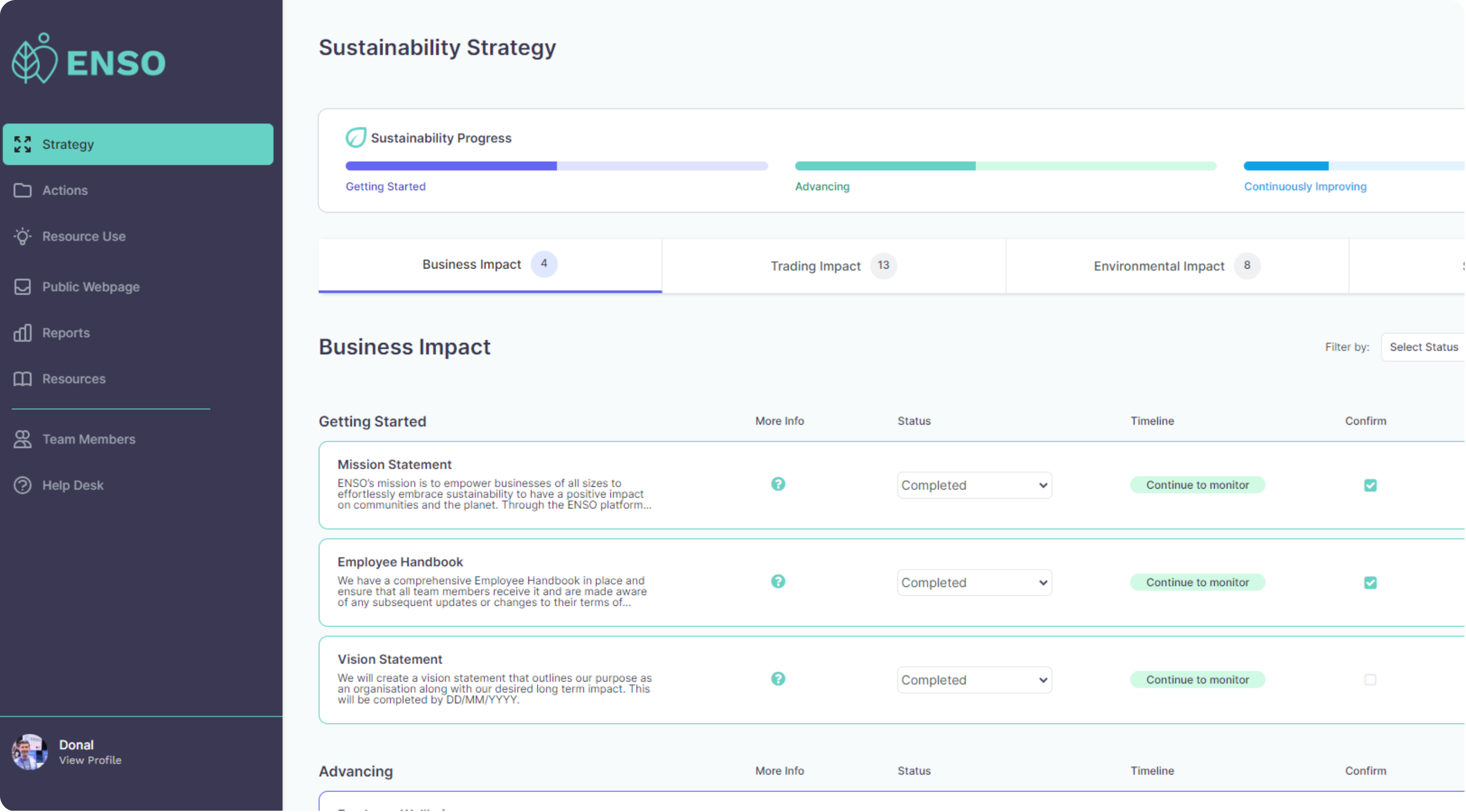 Getting started with sustainability is often the hardest part. ENSO provides a clear structure and framework to help businesses quickly assess what they are already doing, identify gaps and understand where to focus next.